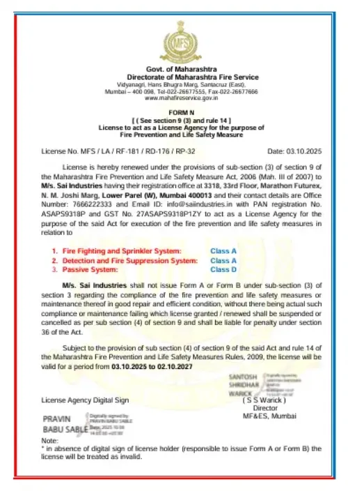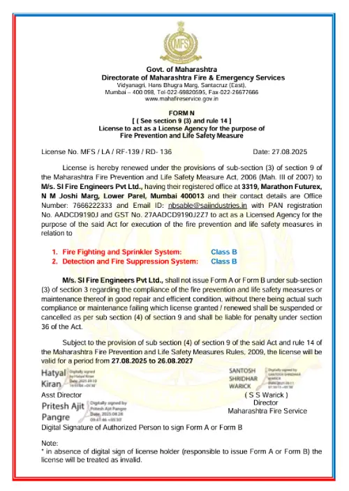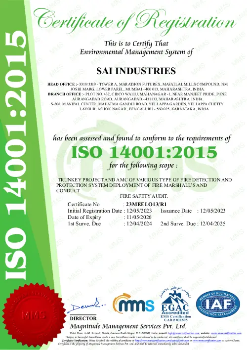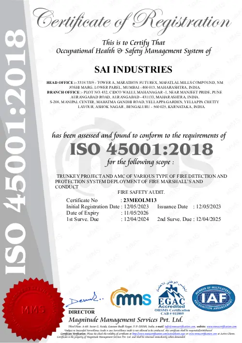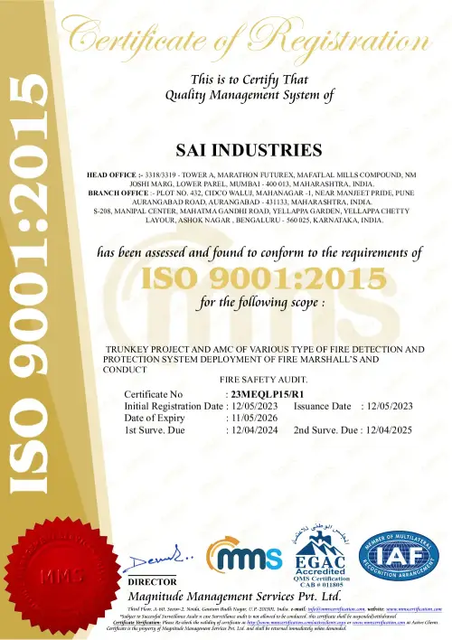 An ISO 9001:2015, ISO 14001:2015, and ISO 45001:2018 certified fire protection consulting and contracting firm known for executing turnkey projects in fire alarm, detection, and suppression systems. Licensed under Class 'A' category by the Directorate of Maharashtra Fire Services.