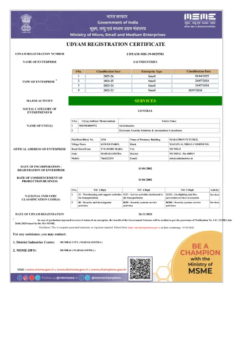 With over 20 + years of experience in the Fire Protection and Electronic Security domains, our group has evolved into a trusted and dynamic enterprise committed to delivering world-class safety solutions across India. For the past 20+ years, our group of companies Sai Industries, SI Fire Engineers Pvt. Ltd. and ESSAC India has continually set benchmarks in the fields of Fire Safety Engineering, Security Systems, and Integrated Automation.